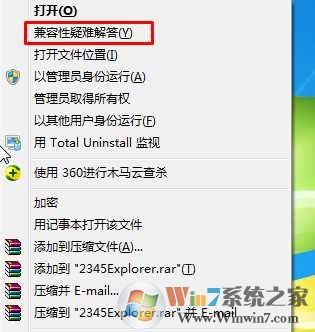 1、右鍵點擊要操作的軟件圖標,然后就可以看到菜單中有一個“兼容性疑難解答”選項,如下圖