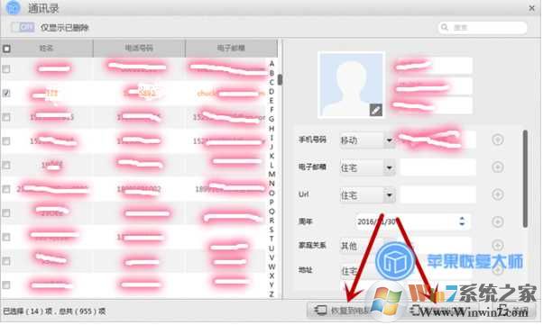 所有存在于iTunes備份中的數(shù)據(jù)都會(huì)顯示出來,其中橙色的數(shù)據(jù)是已經(jīng)被你刪除了的數(shù)據(jù)。這時(shí)候選擇你想恢復(fù)的通訊錄數(shù)據(jù),再點(diǎn)擊右下角的【恢復(fù)到電腦】或者【恢復(fù)到設(shè)備】就可以了。