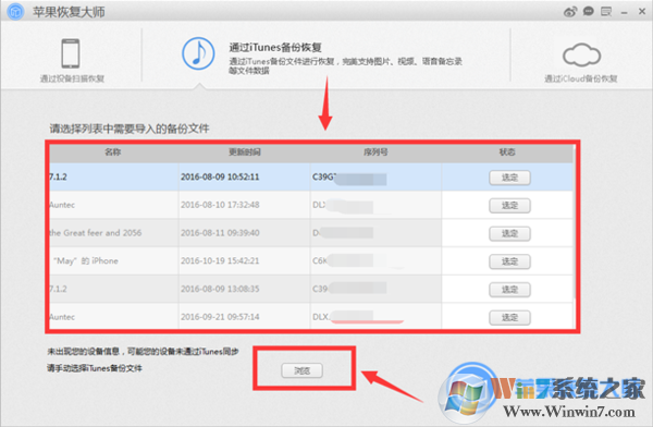 1、打開蘋果恢復(fù)大師,選擇第二種恢復(fù)模式,系統(tǒng)會(huì)自動(dòng)掃描保存在本電腦中的所有iTunes備份文件,如果你要查看的備份沒(méi)有在界面中顯示,你可以點(diǎn)擊【瀏覽】進(jìn)行查找。cncxm.com win7系統(tǒng)之家