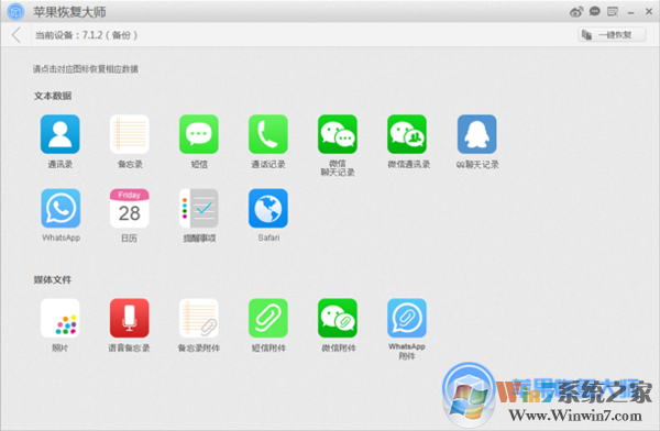 2、進(jìn)入下一個(gè)界面后,你就可以單項(xiàng)查看iTunes備份中的17項(xiàng)數(shù)據(jù),具體如下所示: