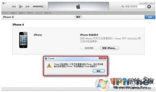 4、電腦端的iTunes將會彈出:“iTunes已檢測到一個處于恢復(fù)模式的Ipad。您必須恢復(fù)此iPad,然后再配合iTunes使用它。”如下圖所示。