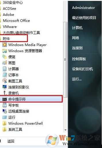1.點擊開始菜單,依次展開所有程序 – 附件 – 命令提示符,打開命令窗口。如下圖所示: