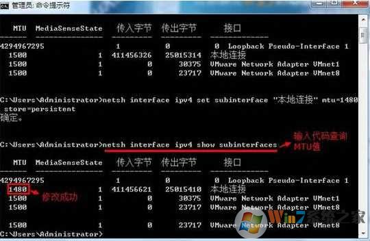 3.輸入“netsh interface ipv4 set subinterface "本地連接" mtu=1480 store=persistent”回車進行本地連接MTU值的修改。如下圖所示: