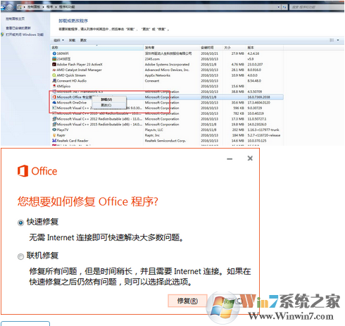 里面找到office2016,右鍵--更改,選擇快速修復(fù)進(jìn)行解決