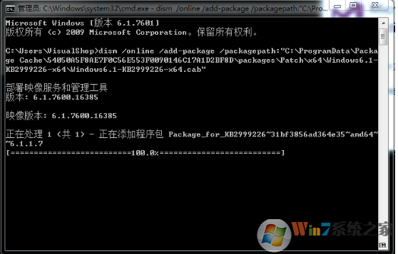 4.以管理員身份運(yùn)行cmd,輸入“dism /online /add-package /packagepath:”冒號(hào)后面加上上一步解壓后的cab文件的位置,回車