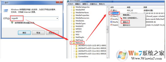 按快捷鍵Win+R → 輸入regedit → 依次展開HKEY_MACHINESYSTEM / CurrentControlSet / Control / Network, → 將config那項(xiàng)直接右鍵刪除后重啟電腦,→ 重啟后打開網(wǎng)絡(luò)連接,正常Windows會重新配置,消失的無線網(wǎng)絡(luò)連接就會顯示出來了。