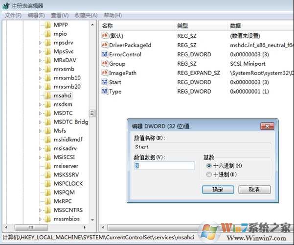 2、找到并單擊下面的注冊表子項:HKEY_LOCAL_MACHINE/System/CurrentControlSet/Services/Msahci