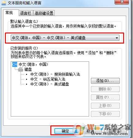 4、然后回到之前界面,選擇 美式鍵盤為默認(rèn)輸入法,這樣確保開(kāi)機(jī)后默認(rèn)使用英文輸入法。