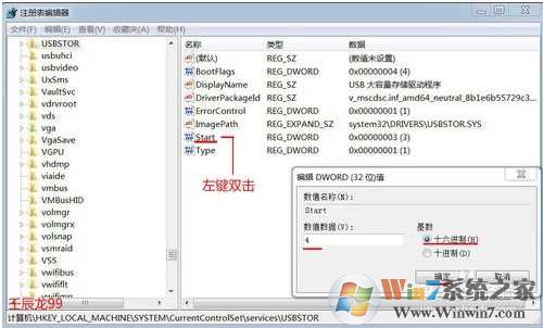 3、在UsbStor對應(yīng)的右側(cè)窗口找到:Start,左鍵雙擊:Start,在彈出的編輯DWORD(32 位)值窗口,把數(shù)值數(shù)據(jù)(V)欄中的值從“3”更改為“4”(基數(shù):十六進(jìn)制),再點(diǎn)擊:確定,退出注冊表編輯器;