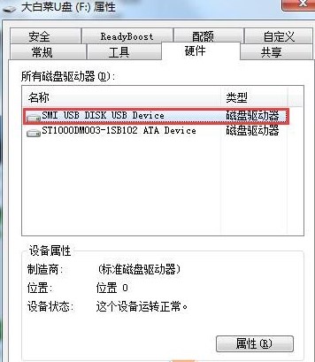 2、彈出可移動(dòng)磁盤屬性窗口,選擇好u盤選項(xiàng)名稱,點(diǎn)擊屬性按鈕;