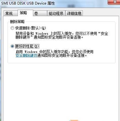3、在u盤屬性窗口中,切換選項(xiàng)卡在“策略”上,點(diǎn)擊單選按鈕“更好的性能”,然后點(diǎn)擊確定按鈕。