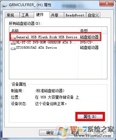 2.打開u盤屬性窗口后,依次點擊“硬件” - “屬性”,如下圖所示: