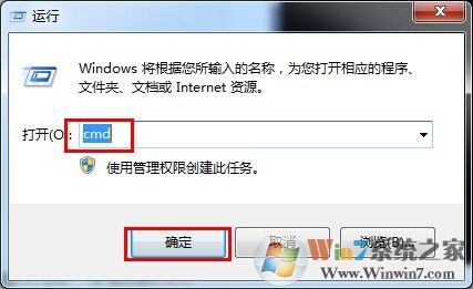 1.按win鍵+r鍵打開運行窗口,然后輸入cmd并按下回車鍵,如下圖所示