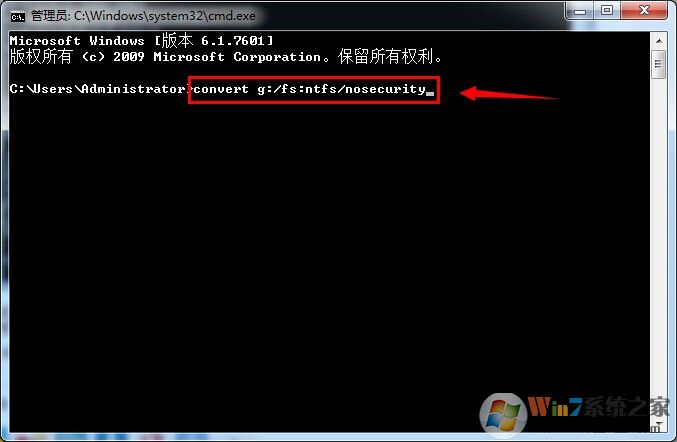 2.輸入該命令convert g:/fs:ntfs/nosecurity(g就是我們U盤的盤符)按回車鍵執(zhí)行,如下圖所示