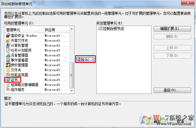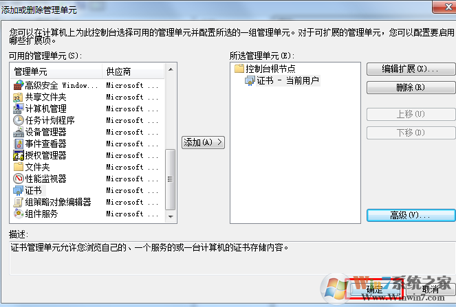2、點(diǎn)擊“文件”---添加/刪除管理單元---選擇“證書”,點(diǎn)擊“添加”按鈕,選擇“我的用戶賬戶”,完成,確定。