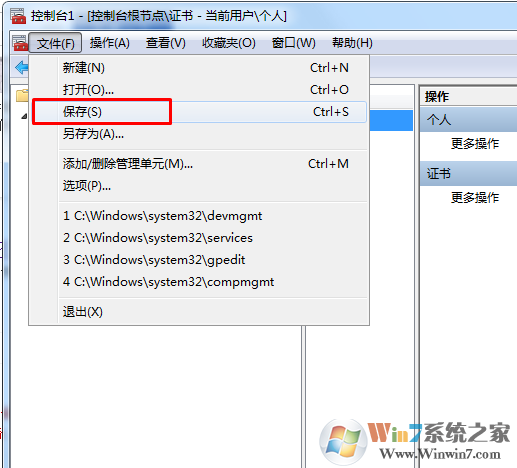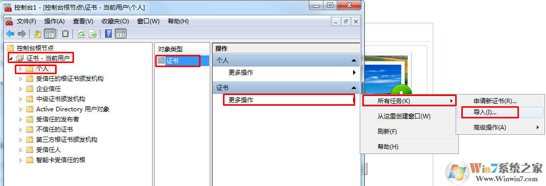 3、展開“證書”,導(dǎo)航到證書--個人--證書,右鍵單擊“證書”--所有任務(wù)---導(dǎo)入