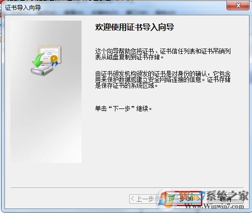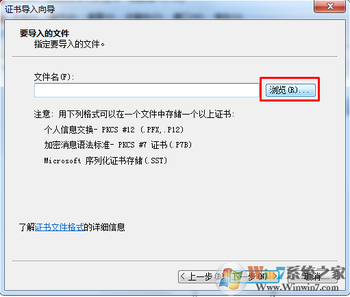 4、打開了“證書導(dǎo)入向?qū)?rdquo;窗口,點(diǎn)擊“下一步”,瀏覽到您備份的pfx密鑰證書,可能會無法找到,將瀏覽窗口下方的文件格式選擇為“個人信息交換(*.pfx;*.p12)”,然后再去找。打開