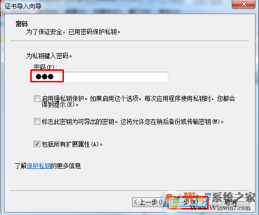 5、下一步,輸入私鑰密碼。如果沒有需要輸入私鑰密碼,則說明原來備份的密鑰沒有導(dǎo)出私鑰,將無法解密。輸入后,點(diǎn)擊下一步。
