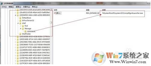4、同樣方法開發(fā)注冊表編輯器,定位到HKEY_LOCAL_MACHINE\SOFTWARE\Classes\CLSID\{20D04FE0-3AEA-1069-A2D8-08002B30309D}\shell\Manage\command,將右窗格中的“默認(rèn)”鍵值(雙擊打開)修改為mmc.exe %windir%\system32\compmgmt.msc 。關(guān)閉注冊表編輯器,此時“管理”應(yīng)該可以打開了,此方法可以修復(fù)由于CompMgmtLauncher.exe 調(diào)用失效所引起的“管理”打不開,此時系統(tǒng)將直接調(diào)用compmgmt.msc而不是CompMgmtLauncher.exe