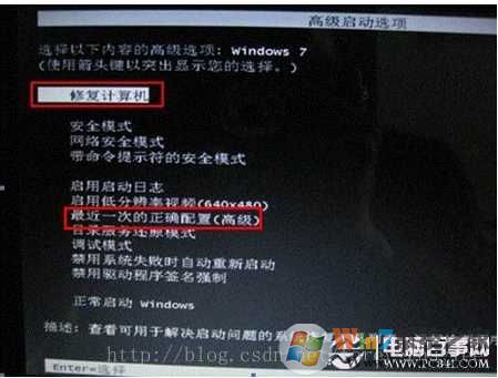 1.重啟按住F8進入系統(tǒng)高級選項模式,然后選擇最后一次正確配置恢復(fù)系統(tǒng)。