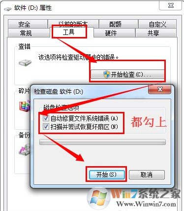 1、右鍵點擊“移動硬盤/U盤”→“屬性”,在彈出的窗口中選擇“工具”→“開始檢查”→將“自動修復(fù)文件系統(tǒng)錯誤”和“掃描并嘗試恢復(fù)壞扇區(qū)”。