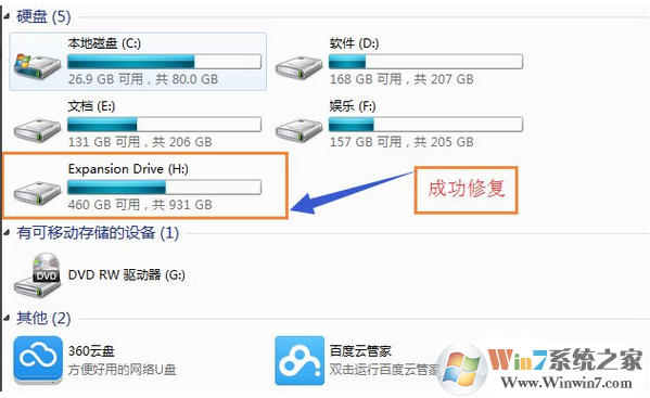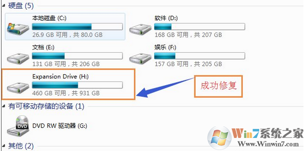 3、修復(fù)完成之后“我的電腦”也正常顯示磁盤空間,雙擊正常啟動。