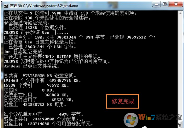 2、輸入“chkdsk H:/f”這里修復(fù)的H盤,修復(fù)D盤就是“chkdsk D:/f”,系統(tǒng)開始修復(fù),過一會兒就修復(fù)完成了。