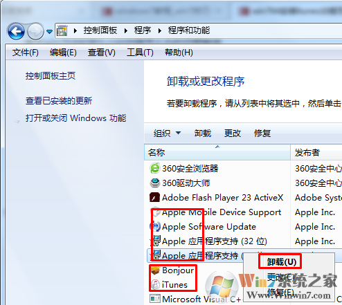 2、在這里我把后面帶有apple Inc.這個(gè)尾巴的全部卸載,可以上下拖動(dòng)看看有沒有遺漏,再重新裝剛剛下載好的ITunes軟件包;