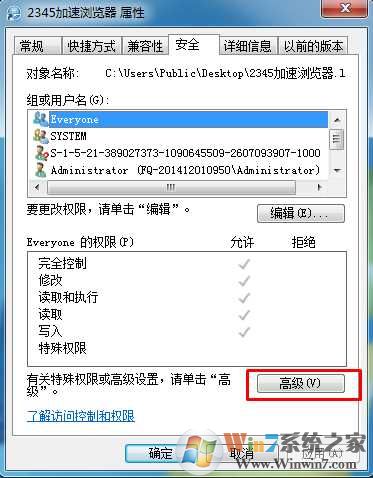 2、打開屬性后,在安全下點擊高級;