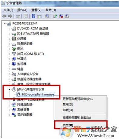 2、設(shè)備管理器打開后,找到鼠標(biāo),右鍵點(diǎn)擊“屬性”。