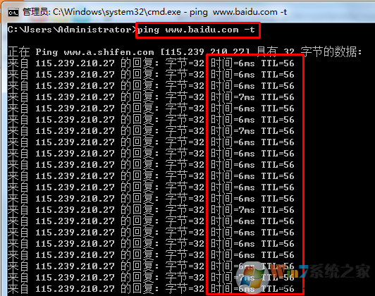 2、輸入ping www.baidu.com -t 確定,我們可以看見如下圖所示,這2個數(shù)值是非常穩(wěn)定的,如果波動很大就保修吧,正常數(shù)值的話,時間不能大于20ms,tll不能高于100,2個數(shù)值高于20和100的話就會照成卡頓