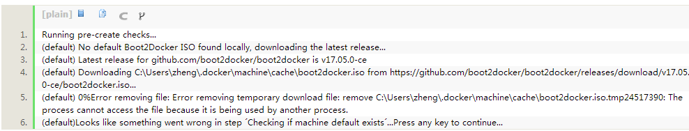 如果存在下載失敗的臨時文件,要將其刪除。(我的機器上的路徑是C:\Users\zheng\.docker\machine\cache\boot2docker.iso.tmp24517390)