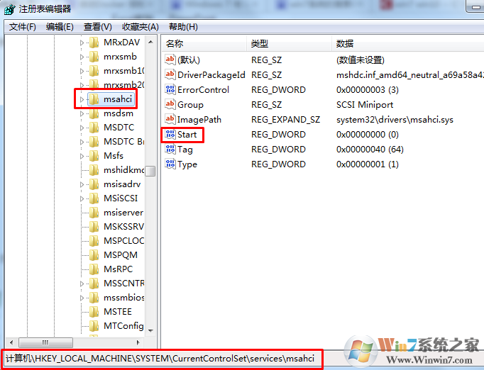 二、然后在注冊(cè)表編輯器中,依次進(jìn)入HKEY_LOCAL_MACHINE\System\CurrentControlSet\Services\Msahci鍵值,然后在右邊的窗口中雙擊START項(xiàng)目,即會(huì)彈出一個(gè)對(duì)話框。