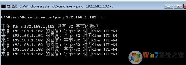a.比如檢測(cè)一下內(nèi)網(wǎng)是否連通,假如內(nèi)網(wǎng)其他機(jī)器的IP是192.168.1.102,我們就可以用ping 192.168.1.102 -t,-t是一直ping,如圖所示:
