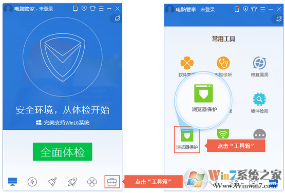 1、打開電腦管家 – 點(diǎn)擊“工具箱” – 點(diǎn)擊“瀏覽器保護(hù)”。