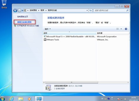 (1)進入安全模式的情況下,選擇開始---控制面板---程序和功能,點選"查看已安裝的更新",如圖: