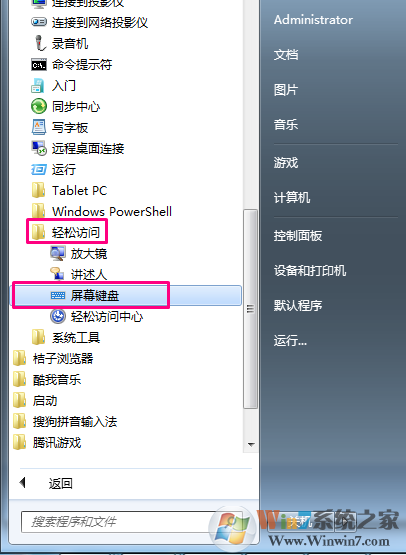 第一步我們要先打開win7系統(tǒng)自帶的屏幕鍵盤,依次打開 開始菜單--所有程序---附件--輕松訪問---選擇屏幕鍵盤