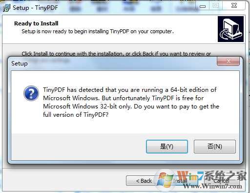 目前網(wǎng)上下載的TinyPDF均是32位版本,不支持64位系統(tǒng),如果你的系統(tǒng)是Win7 64位的話,那么將無(wú)法安裝成功。