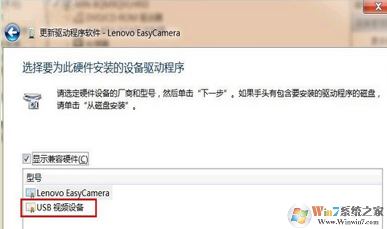 5、彈出選擇為此硬件安裝的設(shè)備驅(qū)動(dòng)程序中,型號(hào)處選擇“usb視頻設(shè)備”驅(qū)動(dòng)更新。