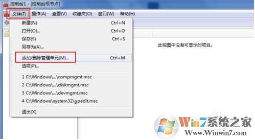 3、在控制臺根節(jié)點對話框,依次點擊文件-添加/刪除管理單元,打開添加/刪除管理單元對話框。