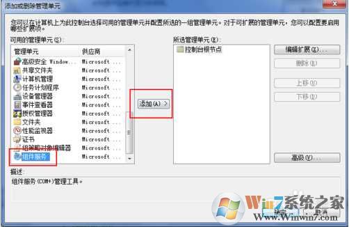 然后在左側(cè)“可用的管理單元”處,將滾動條拉到最下,單擊“組件服務(wù)”,再點擊中間的“添加”按鈕。