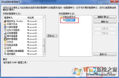 5、然后“組件服務(wù)”這個選項就到了右側(cè)的“所選管理單元”處,然后點擊確定。