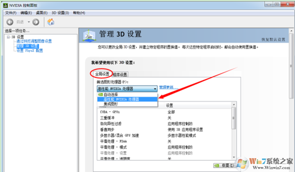 2)依次點(diǎn)擊管理3D設(shè)置——全局設(shè)置——高性能NVIDIA處理器——點(diǎn)擊“應(yīng)用”按鈕保存即可。