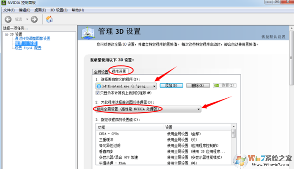 3)(可選步驟)管理3D設(shè)置 > 程序設(shè)置 > 添加剛啟動(dòng)谷的猩猩助手進(jìn)程 HD-Frontend.exe。