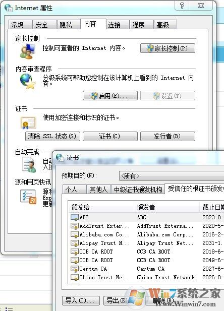 點擊“證書”按鈕,在打開的選項框中選擇“受信任的根證書頒發(fā)機(jī)構(gòu)”,接下來點左下角的“導(dǎo)入”按鈕導(dǎo)入相關(guān)的證書即可。