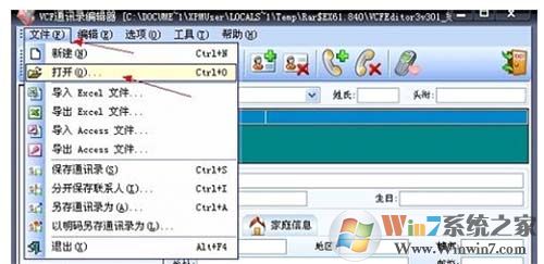 1、運(yùn)行VCF通訊錄編輯器軟件,單擊“文件”菜單中的“打開(kāi)”命令