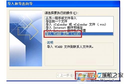 3、打開(kāi)“導(dǎo)入和導(dǎo)出向?qū)?rdquo;對(duì)話框,在請(qǐng)選擇要執(zhí)行的操作列表框中選中“導(dǎo)入 VCARD 文件(.vcf)”,單擊“下一步”按鈕