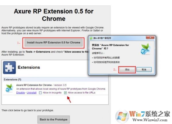 點擊圖中(1)處紅框部位的按鈕,系統(tǒng)會彈出“確認新增擴展程序”對話框,點擊(2)處紅框部位的“添加”按鈕。