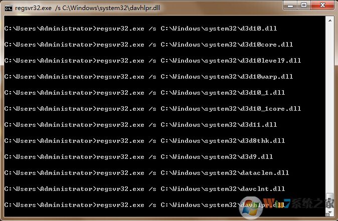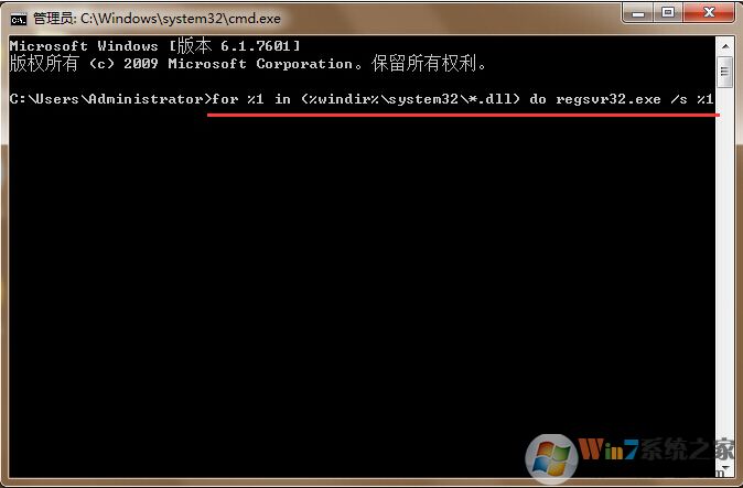 2.在打開的命令窗口中輸入“for %1 in (%windir%\system32\*.dll) do regsvr32.exe /s %1”回車確認(rèn)。如下圖所示