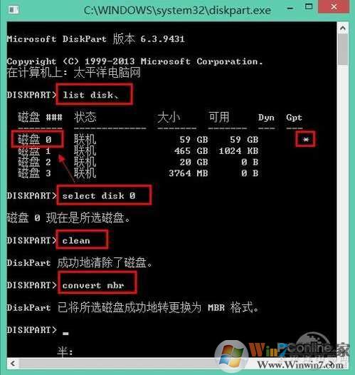 在Diskpart里輸入"List Disk",然后輸入“Select disk 0”(注:不一定是0,可能是1或者2,判斷根據(jù)是看0是不是GPT磁盤)。